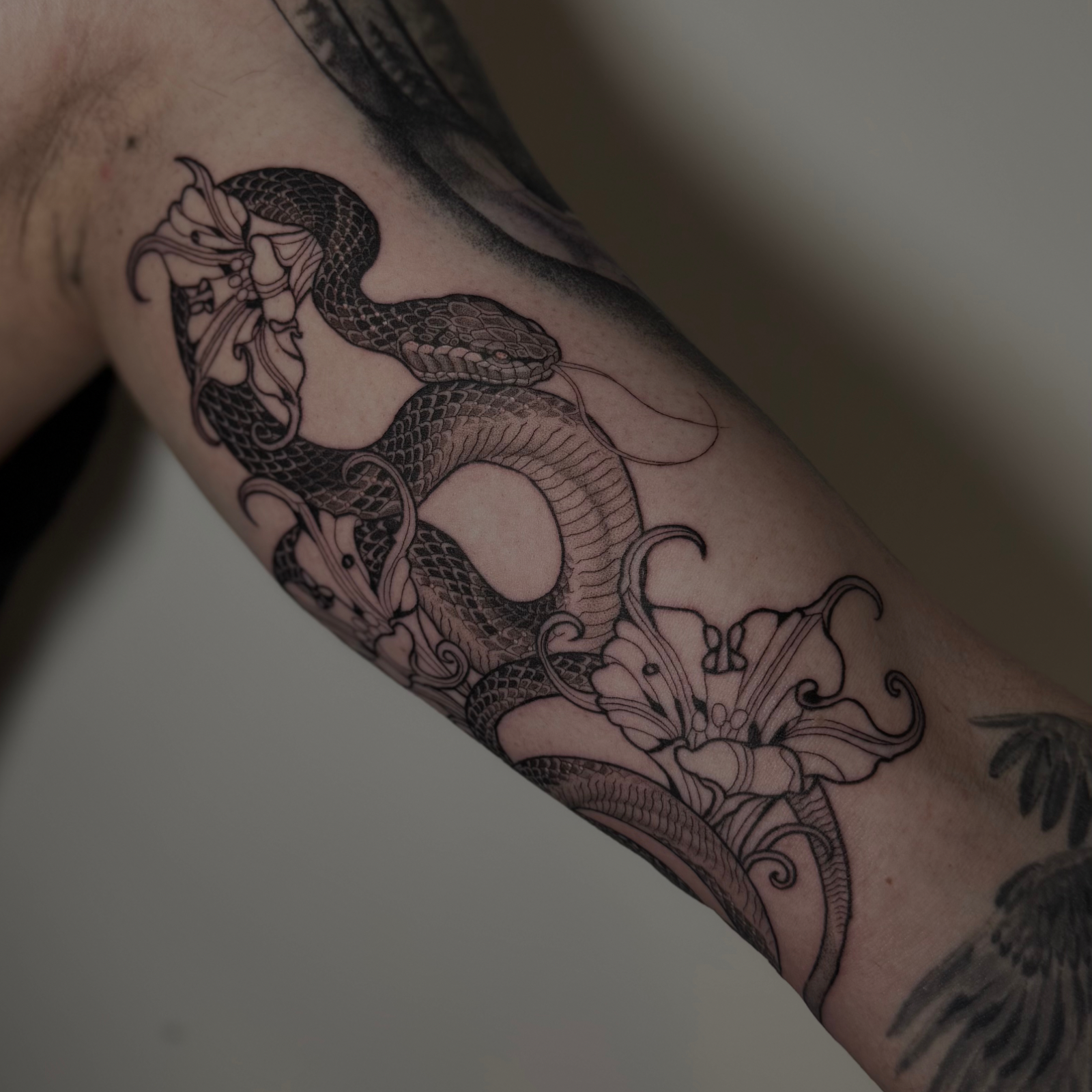 Viele seiner Designs entstehen direkt auf der Haut, wodurch jedes Tattoo individuell an den Körper angepasst wird und natürlich mit ihm wirkt. Präzision, Struktur und eine ruhige Arbeitsweise stehen dabei im Fokus.